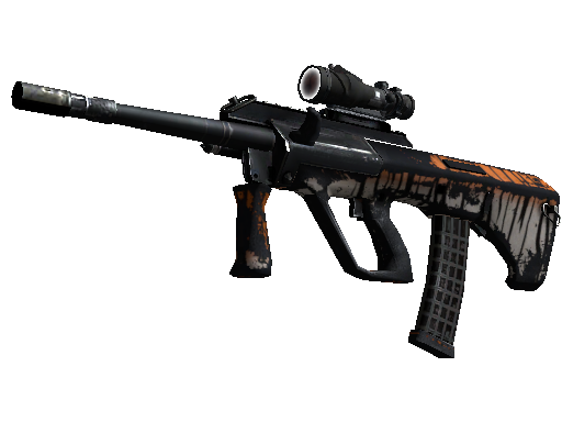 Powerful and accurate, the AUG scoped assault rifle compensates for its long reload times with low spread and a high rate of fire. It has been painted using a tiger stripe hydrographic.
