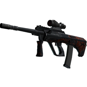 Powerful and accurate, the AUG scoped assault rifle compensates for its long reload times with low spread and a high rate of fire. A red circuit board pattern has been applied over a black base.